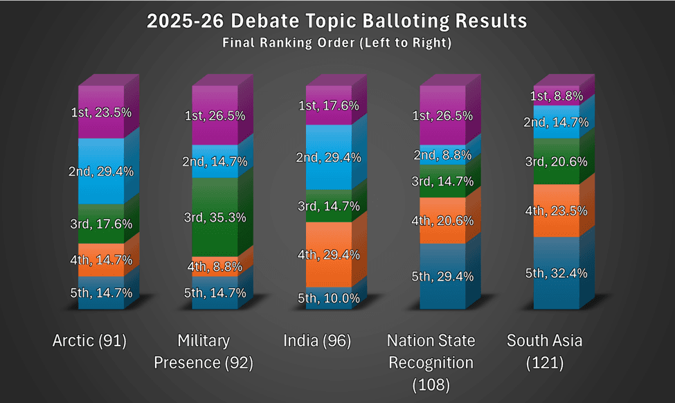 The two topic areas receiving the lowest total ranking scores were “Arctic” and “Military Presence.” These two topics will be placed on a final ballot, which will be sent to states and partner organizations for a final vote. On January 10, 2025, the NFHS will announce the preferred topic area and resolution, and the 2025-2026 national high school debate topic and resolution will be posted on the NFHS Speech and Debate webpage and sent to state associations and affiliate members.